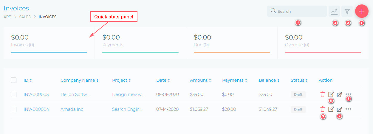 - (2) Filter invoices, using a detailed filter panel. You can filter invoices by dates, categories, statuses, etc.