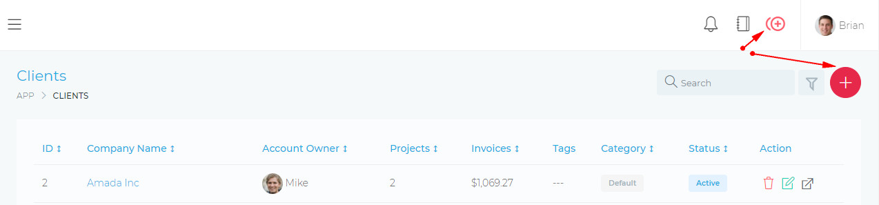 You can create a new client account by clicking on the Quick Add icon or by clicking on the action_column.