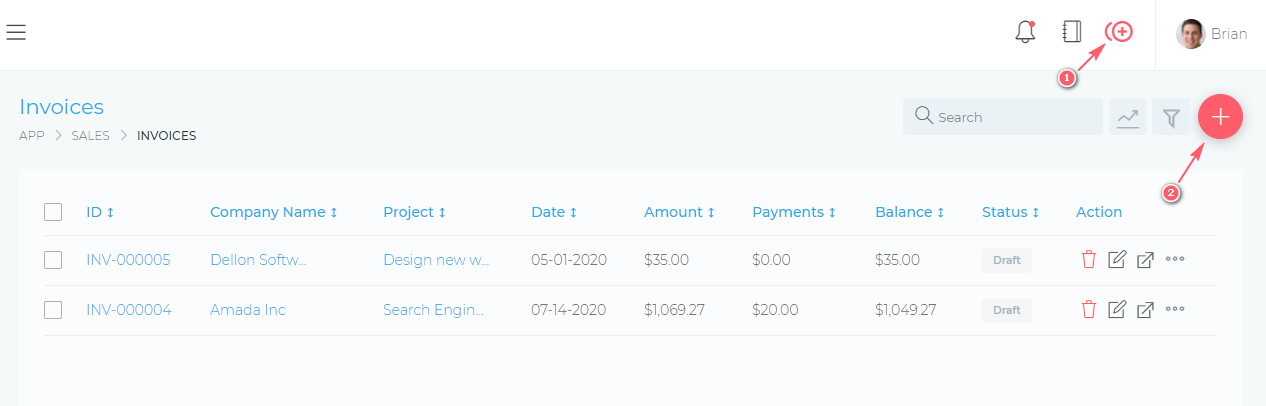 You can create a new invoice by clicking on the (1) Quick Add icon or by clicking on the (2) Add Invoice Button.