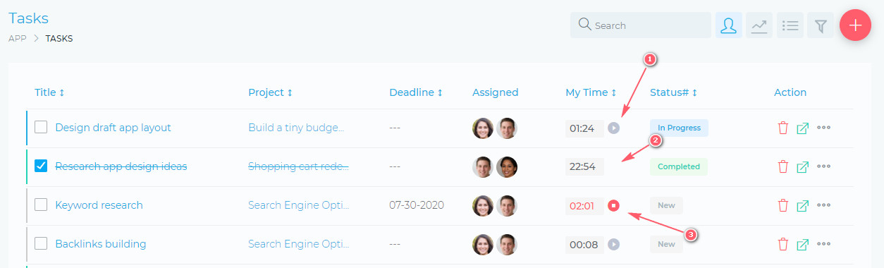 - (3) This is a task that you are currently working on and the timer is running. You can stop this timer by simply clicking the stop icon.