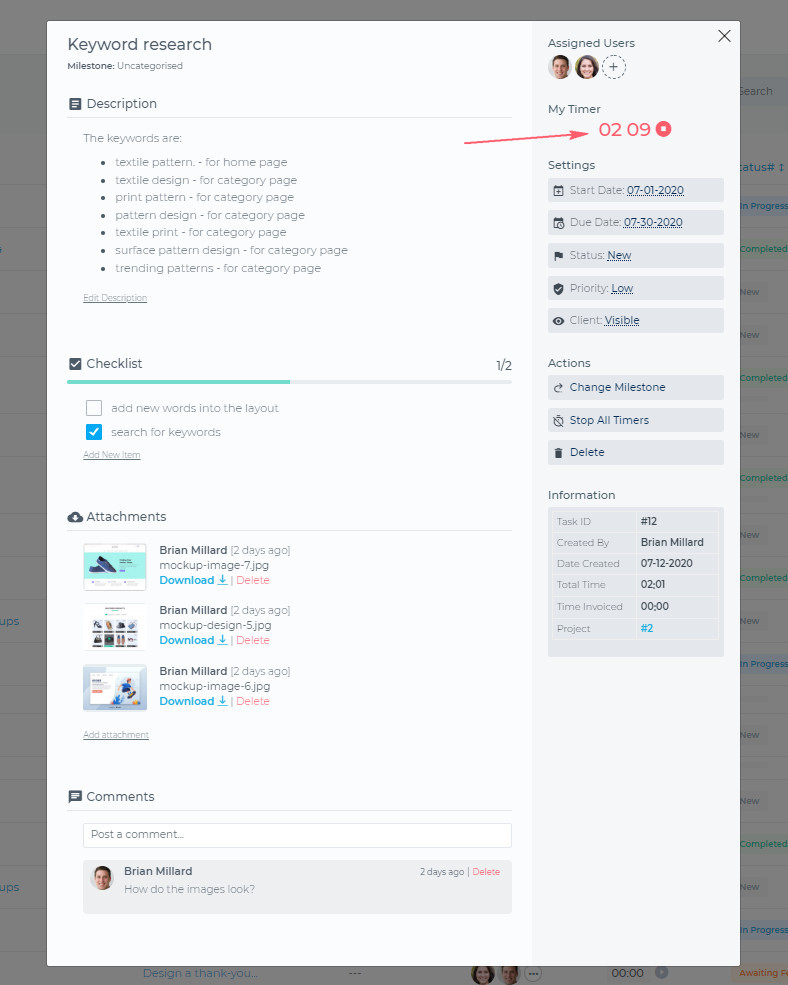 - (1) You are assigned to this task, but the timer is currently not running. When you start working on this task, you can click the start/play icon, and the timer will start recording.