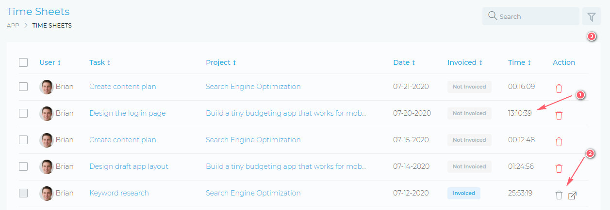 - (3) The filter feature helps you to find specific time records. You are also able to group time records, per task or per user, for a broader view.