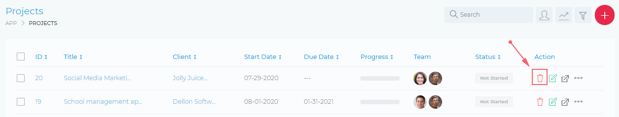 To delete a project, click on the Delete Icon, as shown in the image below: