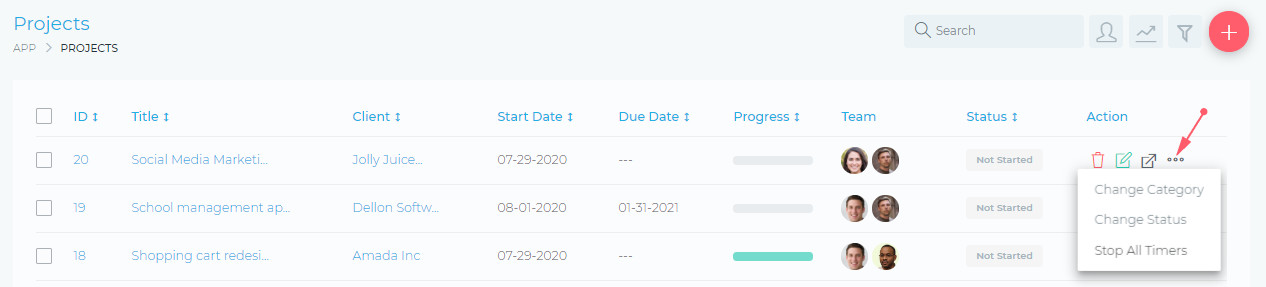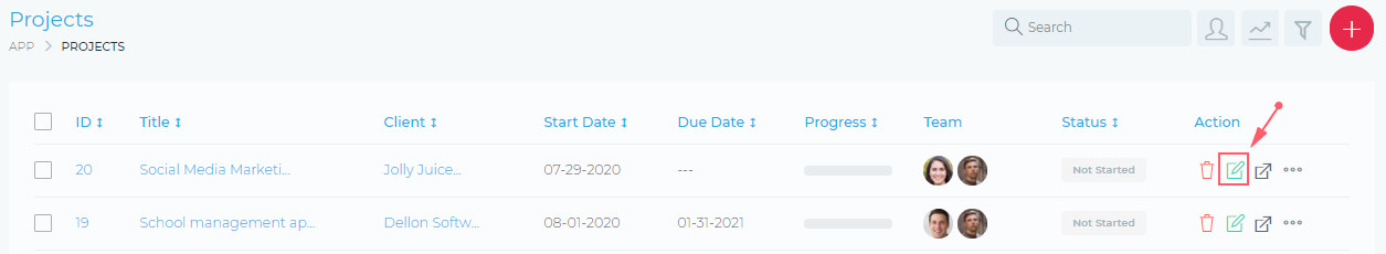 To edit a project, click on the Edit Icon, as shown in the image below: